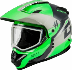 - Helmet includes a dual lens snow shield, cold weather breath box and chin curtain