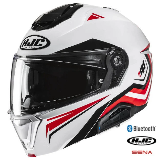 The HJC i91 Helmet is constructed from a poly carbonate composite shell with high performance air circulation. Three shell sizes provide a better fit while removable and washable cheek pads keep every ride fresh. A dynamic HJ-V12 sun visor eliminates the need for sunglasses.
